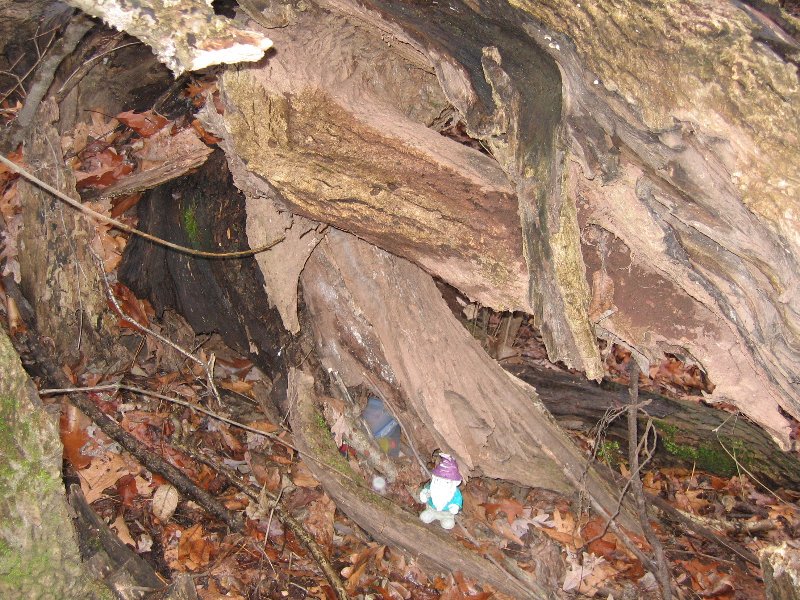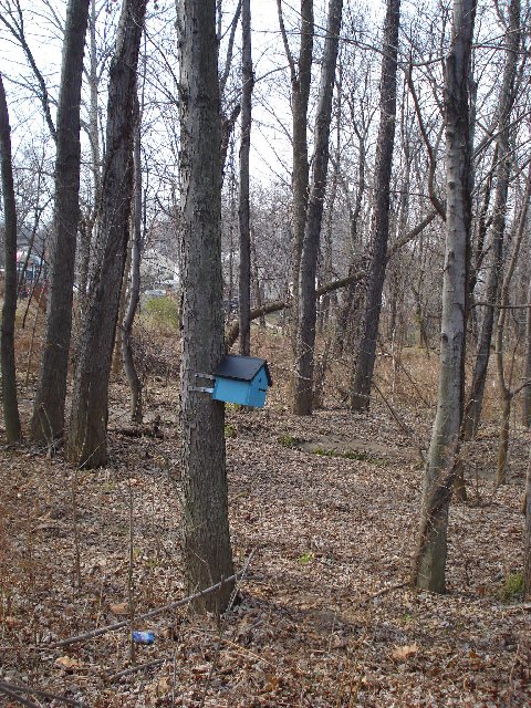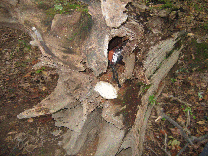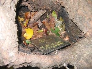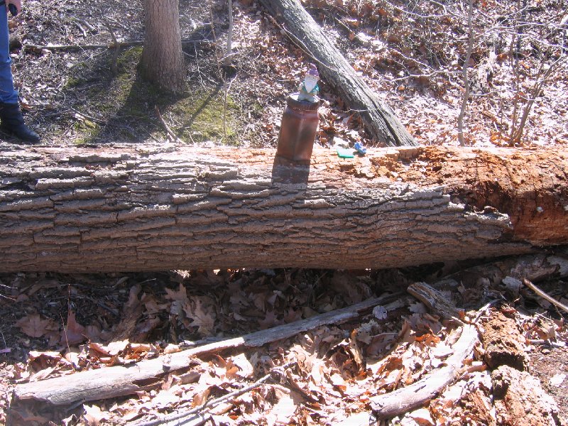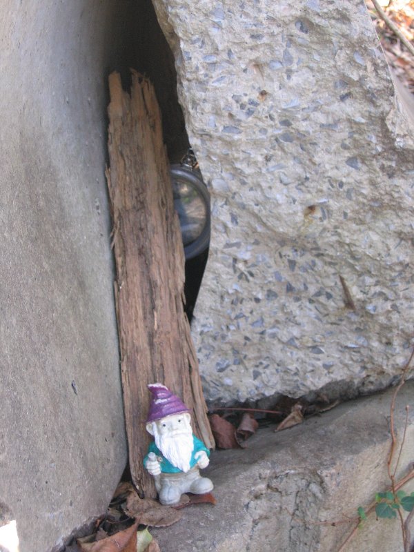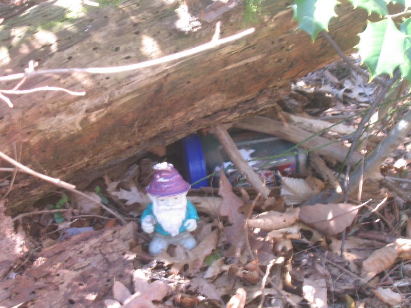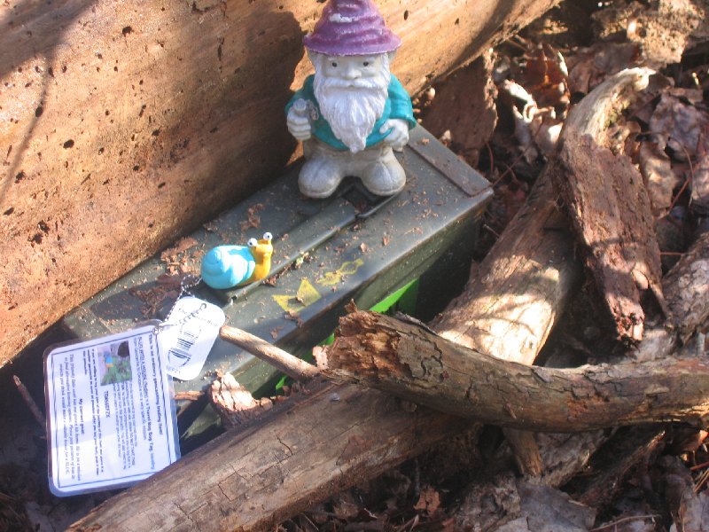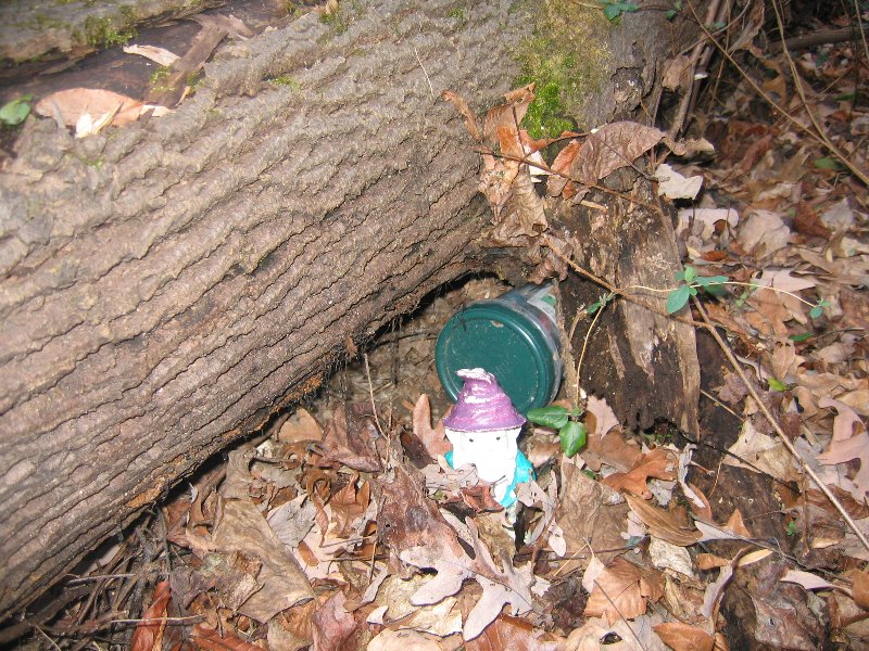 Cache is biggish plastic comtainer painted brown with a screw-top lid. This is the replacement cache for the thrice-muggled Springfield Travel Bug Hotel (GCXHC2) and it is the sister cache to the North Shore Travel Bug Hotel (GCT770) and the Ox Road Travel Bug Hotel (GC11177).