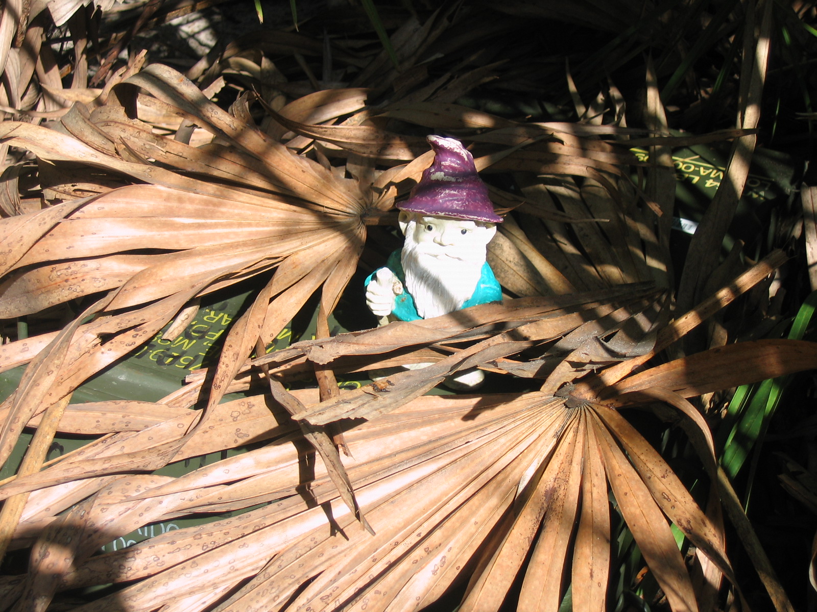 HINT: To the right of a trash can at the base of a tree covered with palm fronds
