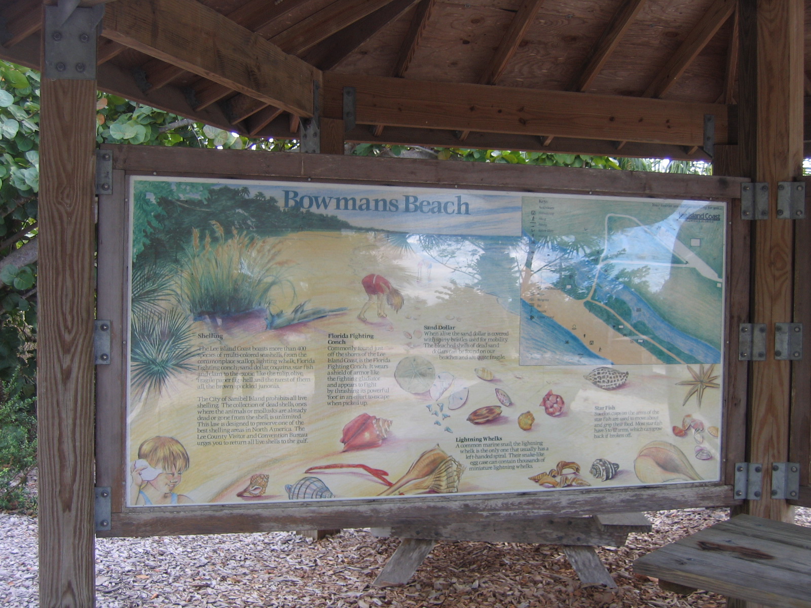 Located in pretty Bowman's Beach Park. Bowman's Beach is a popular spot with great shelling, picnic tables, bathrooms,and bike racks. Directions: after the Sanibel causeway bridge, make a right on Periwinkle Way to Tarpon Bay Road. Turn right on Tarpon Bay Road then, then left at the 4-way stop on to Sanibel-Captiva Road. From this road, turn left to Bowman's Beach Road (brown sign). ($ Parking)