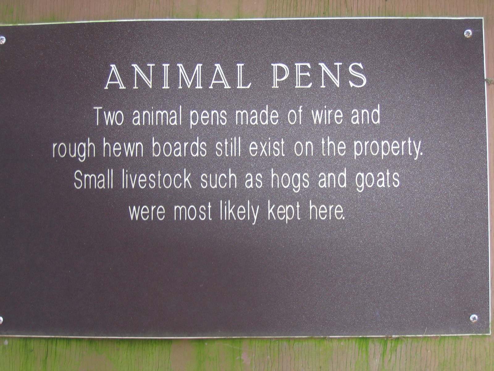 4 – What is the 5th and 7th word on the second to the last line of the plaque titled “Animal Pens”?