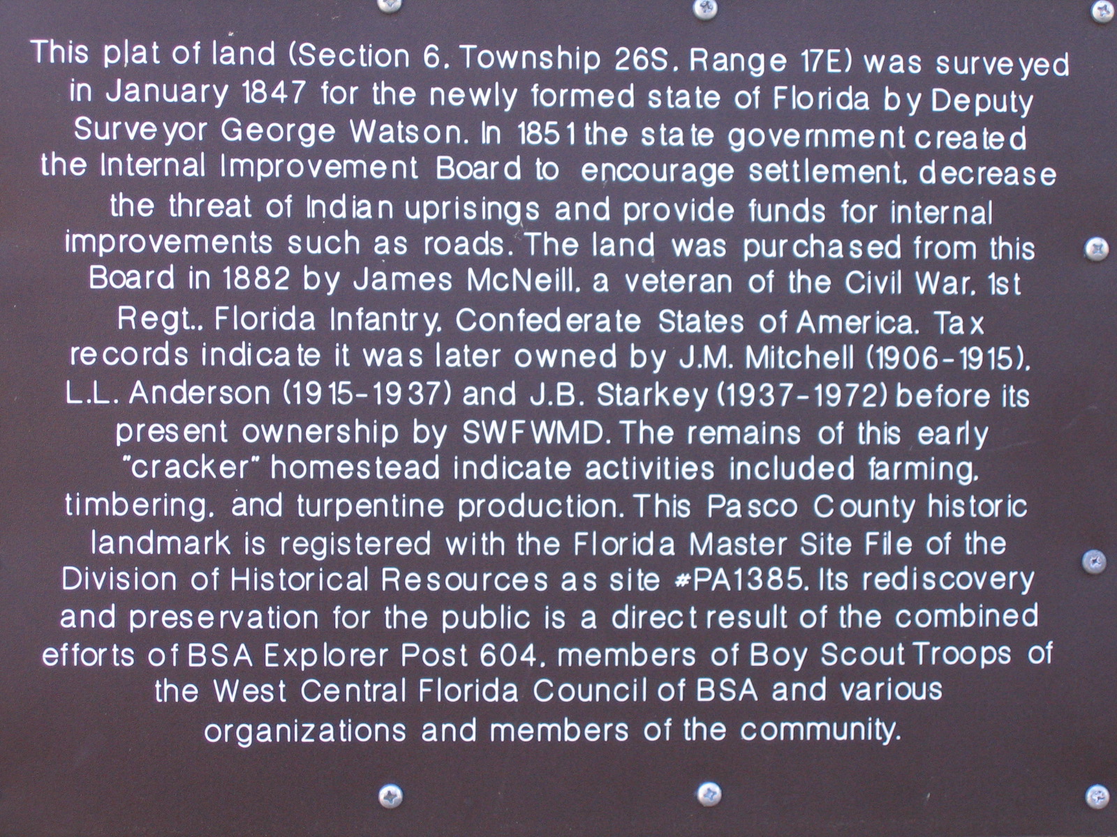 While hiking around one of my favorite parks the other day, I came across a new archeological dig of the old McNeil Homestead on the same land that is present day Starkey Wilderness Park in Pasco County. This site has been unearthed and preserved with the help of Boy Scout Explorer Post 604, members of Boy Scout Troops of the West Central Florida Council of BSA, and is a great example of what the layout of an early settlement in Florida was like. Included at this location are the remnants of a well, house, pasture, animal pens and gravesite. There is a very informative kiosk at the location with old maps of the location, a history of McNeil (a Civil War veteran), and interesting facts about the area.